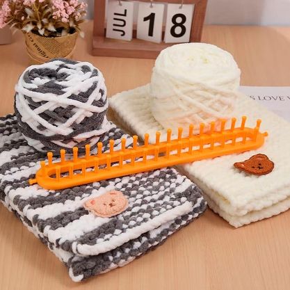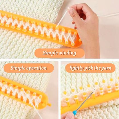 - Sposób użycia: Aby użyć Knitewise, umieść włóczkę na akcesorium i zawiąż węzeł. Następnie owiń wełnę wokół urządzenia. Użyj haczyka do zdejmowania, aby usunąć dzianinę z akcesorium.